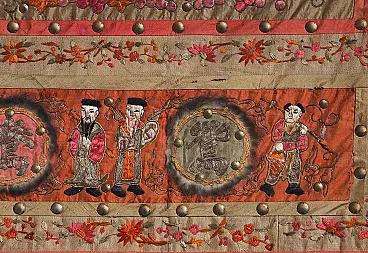databile alla prima metà del XIX secolo (periodo Qing) in seta ricamata ed impreziosita da applicazioni metalliche, nei toni del rosso-arancio, oro e magenta con borchie in metallo dorato e frange dorate.