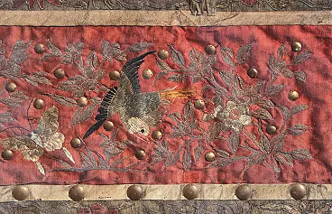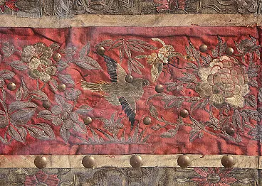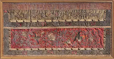 databile alla prima metà del XIX secolo (periodo Qing) in seta ricamata ed impreziosita da applicazioni metalliche, nei toni del rosso cremisi, oro, beige, grigio-verde e rosa.