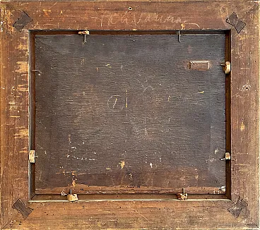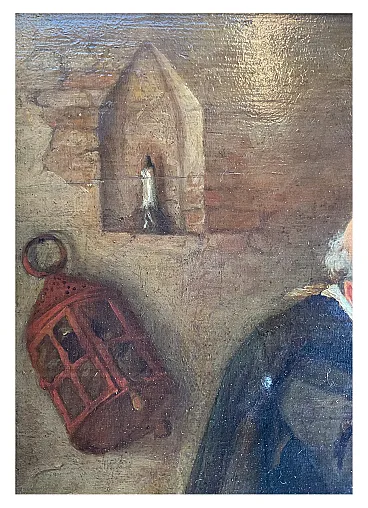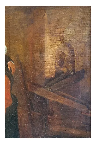 Il dipinto in oggetto è un olio su tavola di dimensioni 28,4×34 cm. e si ritiene corretta l'attribuzione a Teniers il Giovane (1610-1690), uno dei più celebri pittori fiamminghi del XVII secolo, o comunque ad un abile artista attivo all'interno della sua cerchia. La scena raffigura un interno rustico, con due figure centrali, un uomo anziano e una donna, rappresentati in un momento di intimità scherzosa. L'uomo, vestito con abiti scuri che suggeriscono un certo decoro borghese, si avvicina alla donna, verosimilmente una servitrice, posando affettuosamente la mano sotto il suo mento, mentre l'altra mano è appoggiata sul suo braccio. La donna, abbigliata con un grembiule bianco e una cuffia tradizionale, mostra un lieve sorriso, in una posa di timida complicità.
