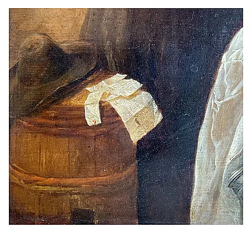 L'ambiente è ricco di dettagli narrativi: sulla sinistra si nota un barile con poggiato sopra un foglio spiegazzato, elementi che richiamano la quotidianità domestica, mentre sullo sfondo si intravedono un focolare e una lanterna appesa. La composizione è bilanciata, con un uso sapiente della luce che evidenzia i volti e i gesti dei protagonisti, conferendo profondità e vitalità alla scena.
