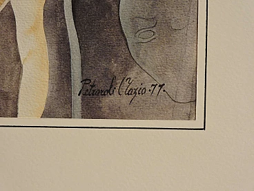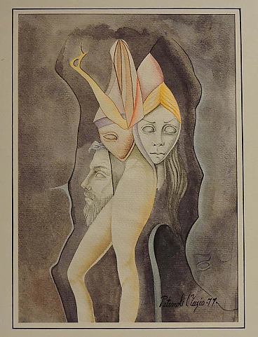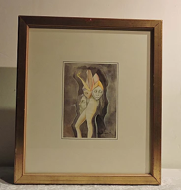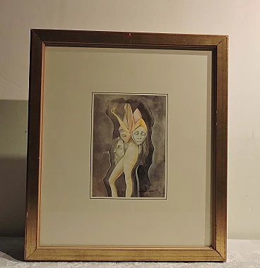 Acquerello su cartoncino di composizione con autoritratto, firmato