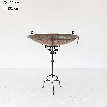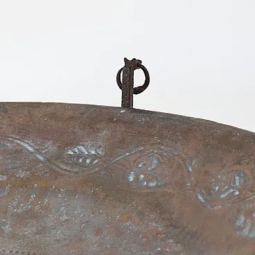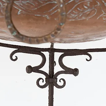 Piatto decorativo in rame con struttura in ferro battuto, anni '50