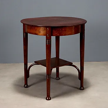 Tavolino da centro in faggio tinto noce, in stile Thonèt. Piano tondo sorretto da quattro gambe tornite unite da ripiano centrale sorretto da supporti a crociera. Austria, inizio XX Secolo.