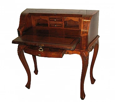 Ribaltina Vecchia Cerea, anni '70. Mobile scrittoio sagomato, produzione italiana (Veneta). La ribaltina è in parte impiallacciata noce e radica di noce e in parte a massello. Buono stato di conservazione, piccoli segni di vissuto alla vernice. Anta a ribalta con chiave funzionante.
