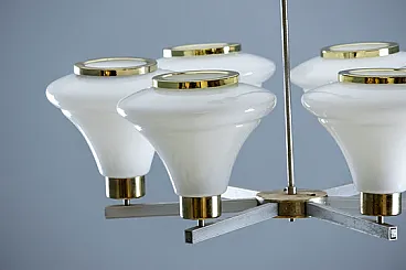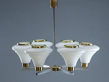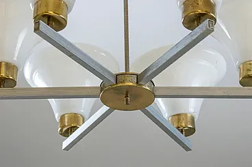 L'apparecchio è dotato di sei paralumi in vetro opalino svasato montati su una struttura in ottone e metallo, sospesi a un'asta centrale. La geometria minimalista e i caldi toni dell'ottone evocano la raffinatezza della metà del secolo diffondendo la luce con un bagliore morbido e atmosferico.