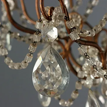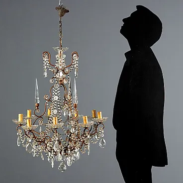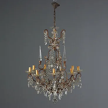 Lampadario a nove luci in ferro dorato e vetro, fine '800