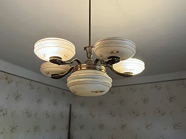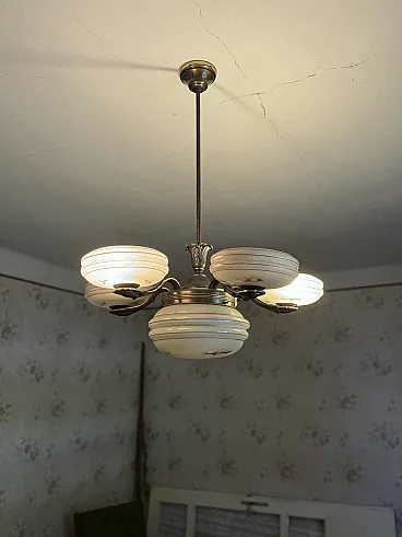 Lampadario Art Déco a 5 braccia in ottone e vetro, anni '40