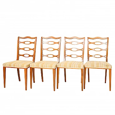 Sedie in legno con seduta imbottita e rivestita di tessuto a righe color ocra. Lo schienale in legno presenta un particolare disegno a intreccio.