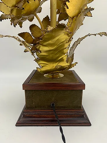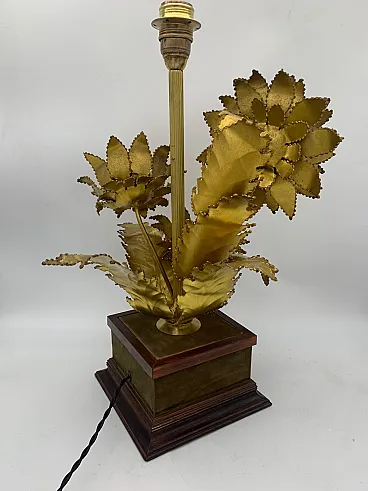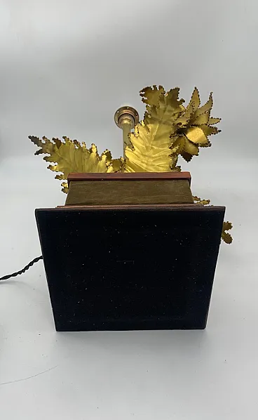 Lampada da tavolo dal design scultoreo e decorativo attribuita alla ditta Barbi, made in italy, caratterizzata da una base solida in legno con profili sagomati e rivestimento in velluto marrone, su cui si erge una composizione artistica in metallo dorato raffigurante tre grandi girasoli stilizzati. I fiori, realizzati con cura artigianale, presentano petali martellati e sagomati con bordi frastagliati e irregolari, mentre i centri sono costituiti da dischi bombati e testurizzati che imitano la superficie dei veri capolini dei girasoli. Le foglie e gli steli metallici, anch’essi dorati e leggermente ossidati, conferiscono movimento e realismo alla composizione, creando un effetto di ricca plasticità e dinamismo. Dal centro della scultura si innalza un fusto verticale scanalato, sempre dorato, che funge da supporto per il portalampada superiore. L’insieme, dal gusto vintage e art déco, unisce eleganza e teatralità, evocando la tradizione delle lampade decorative italiane.