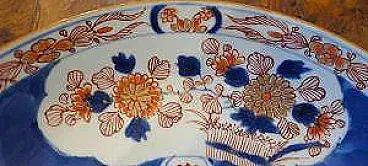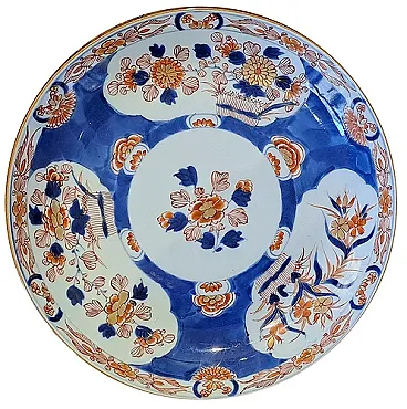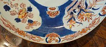 La decorazione si ispira chiaramente allo stile giapponese Imari, combinando il classico blu sottosmalto con smalti soprasmalto arancioni (rosso ferro) e dettagli dorati. Questo tipo di porcellana era molto popolare in Europa in quel periodo. Decorazione: Il piatto presenta un motivo floreale centrale circondato da riserve a forma di nuvola (o "cartouches"), alternate a segmenti blu cobalto. Le riserve contengono ulteriori decorazioni floreali stilizzate nei toni dell'arancio, del blu e del bianco. Provenienza e uso: Questi piatti erano prodotti a Jingdezhen, il principale centro di produzione di porcellana in Cina, e venivano esportati in Europa, principalmente attraverso la Compagnia Olandese delle Indie Orientali (VOC). La forma e la ricchezza della decorazione suggeriscono che fosse destinato a un uso espositivo o come parte di un servizio da tavola di lusso. Condizioni: Perfette. Dimensioni: diametro 27 cm