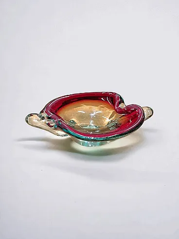 Il design del posacenere può includere elementi tipici di Flavio Poli, come il vetro sommerso, che crea effetti di profondità, o l'uso di colori vivaci e contrastanti che si fondono armoniosamente.