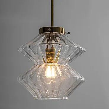 La lampada combina pannelli di cristallo ceco con raccordi in ottone e rame, creando un caldo gioco di superfici riflettenti e traslucide. Progettato per le lampadine E14, fornisce un'illuminazione morbida ma brillante, enfatizzando la qualità scultorea della sua struttura cristallina sfaccettata. Il pezzo rimane intatto e in ottime condizioni originali.