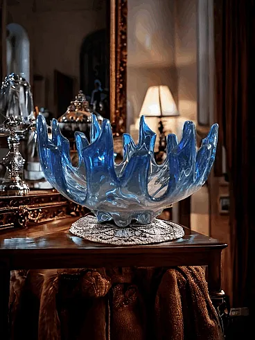 Il centrotavola "scodella" può essere utilizzato come elemento decorativo su un tavolo o una consolle, ma è anche ideale per essere esposto in vetrine o spazi dedicati all'arte. La sua bellezza lo rende perfetto per ambienti moderni, ma si adatta anche a contesti più classici dove può diventare il punto focale di una stanza. In sintesi, un centrotavola in vetro di Murano attribuito a Flavio Poli è un oggetto che porta con sé non solo la maestria artigianale di Murano, ma anche l'influenza di uno dei più grandi maestri vetrari del XX secolo, rendendolo una vera e propria testimonianza dell'arte del vetro.
