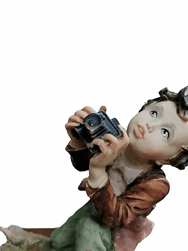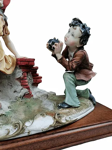 Questa statuetta in porcellana Capodimonte ritrae un momento spontaneo e moderno: un giovane fotografo che, con macchina fotografica in mano, scatta una foto a una ragazza in posa. Firmata da Giuseppe Armani, uno dei maestri della scultura in porcellana, questa composizione si distingue per il realismo e la delicatezza dei dettagli, che immortalano l'espressività dei personaggi e la gioia del momento.