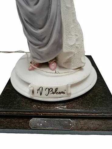 Questa statuetta Capodimonte, firmata da A. Belcari, rappresenta un'elegante scena che cattura la delicatezza di una giovane donna accanto al suo bastone. Realizzata in ceramica di alta qualità, la statuetta è una fusione di arte figurativa e abilità artigianale, tipica della manifattura Capodimonte, celebre per i suoi dettagli minuziosi e la raffinatezza della decorazione.