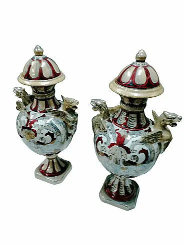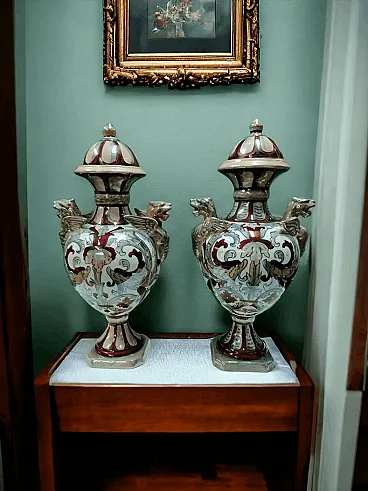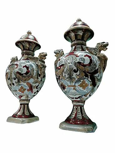 Questa coppia di potiche firmate Gualdo Tadino rappresenta un eccellente esempio della ceramica artigianale italiana, con un design che fonde tradizione e raffinatezza. Le potiche, di forma elegante e raffinata, sono caratterizzate da dettagli scolpiti con maestria e un'accurata decorazione a mano, tipica delle manifatture di Gualdo Tadino. Ogni potiche è un'opera unica che porta con sé l'eredità di una lunga tradizione ceramica, riconosciuta a livello internazionale per la sua qualità e per l'uso di tecniche che affondano le radici nei secoli passati.