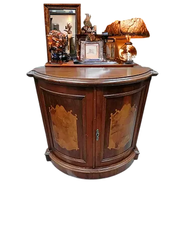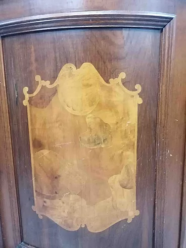 La credenzina è solitamente costruita con legno di alta qualità, come noce o ciliegio, con intarsi in legno di diverse tonalità che formano motivi complessi e armoniosi.