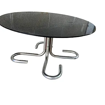 Il tavolino basso da salotto con struttura cromata e piano in vetro rotondo fumè di Giotto Stoppino è un esempio iconico del design italiano degli anni '60, che fonde eleganza, minimalismo e funzionalità in un oggetto dal grande impatto visivo. Giotto Stoppino, noto per la sua capacità di coniugare materiali e forme in modo innovativo, ha creato un tavolino che diventa il cuore di qualsiasi ambiente moderno.