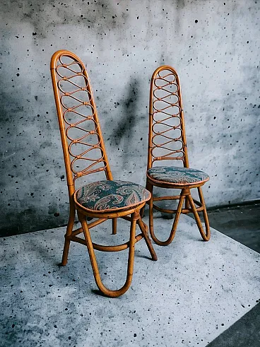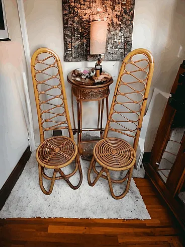 La coppia di sedie con schienale alto in bambù "Bonacina" rappresenta l'eccellenza dell'artigianato italiano in materia di arredi naturali e raffinati. Queste sedie, frutto dell'esperienza della storica azienda Bonacina, famosa per i suoi mobili intrecciati, incarnano un perfetto equilibrio tra estetica e funzionalità, arricchendo l'ambiente con un tocco esotico e sofisticato.