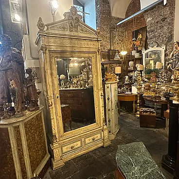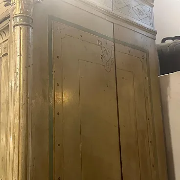Si tratta di un magnifico e raro armadio d'epoca Louis Philippe, risalente alla metà del XIX secolo (1830-1840 circa) e proveniente da un prestigioso palazzo nobiliare in Sicilia. Questo sostanzioso armadio rappresenta l'apice dell'artigianato decorativo italiano dell'epoca e conserva la ricercatissima finitura originale laccata e policroma. Si tratta di un pezzo architettonico straordinario che valorizzerebbe qualsiasi interno sofisticato. La struttura è caratterizzata da una silhouette alta e imponente e da una costruzione in legno massiccio. La finitura presenta una splendida patina invecchiata di lacca color crema o bianco sporco, elegantemente compensata da ricchi dettagli dorati e accenti di azzurro o verde salvia negli intarsi dei pannelli. Il pezzo vanta un grande specchio originale a figura intera incastonato nell'anta centrale, che offre sia utilità che l'effetto di illuminare e ampliare una stanza riflettendo la luce. L'elemento più caratteristico è l'elaborato stemma decorativo che corona il cornicione. Questa scultura altamente dettagliata incorpora una serena maschera centrale femminile o classica, affiancata da due imponenti scudi araldici. Uno scudo è caratterizzato da un leone nero coronato e rampante su un campo d'oro, mentre l'altro mostra una colomba della pace su un campo verde. Questo uso dell'araldica suggerisce fortemente la provenienza nobiliare dell'armadio. Ulteriori ornamenti includono pilastri scanalati, motivi di fogliame classico e delicati arabeschi dipinti sui cassetti e sui pannelli. La base presenta due cassetti funzionali e l'intero pezzo poggia su piedi a zoccolo in stile classico. Questo guardaroba viene offerto in notevoli condizioni d'epoca, mantenendo il suo carattere autentico e la sua integrità storica. Le piccole imperfezioni, tra cui la craquelure naturale e il deterioramento della lacca, testimoniano la sua età e il suo patrimonio siciliano, rendendolo un oggetto da collezione unico e insostituibile.