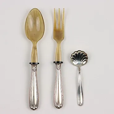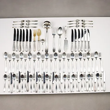 Servizio di posate in argento per dodici persone composto da 7 posate a servire, 12 coltelli, 12 coltelli da frutta, 12 forchette, 12 forchette da frutta, 12 cucchiai, 12 cucchiai da dolce, 12 cucchiaini da caffè. Marchi dell'argento e dell'argentiere incussi. Grammi 4200 al netto dei coltelli e delle posate in osso.