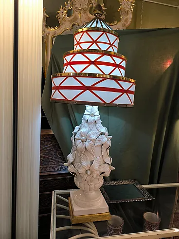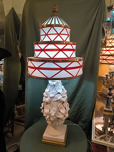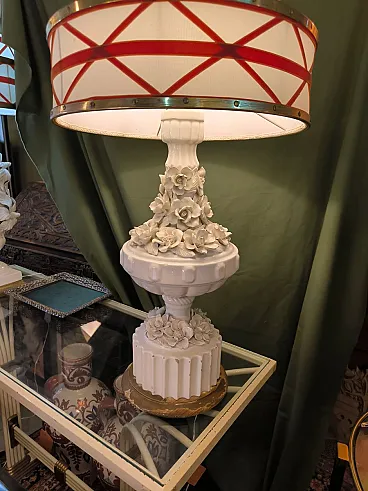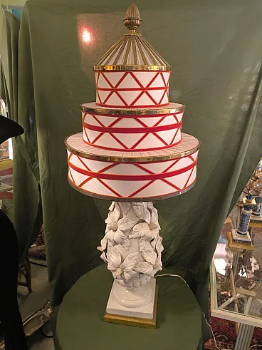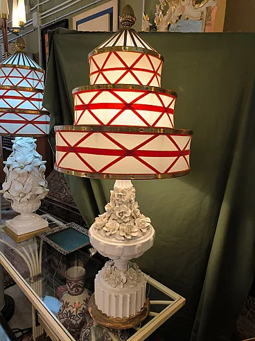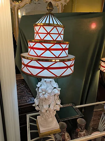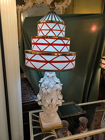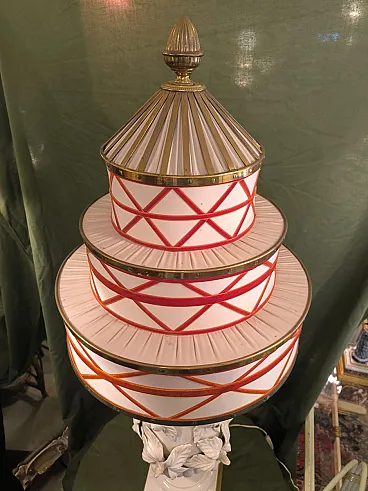 Coppia di lampade in ceramica con paralumi in tessuto e ottone,anni 50