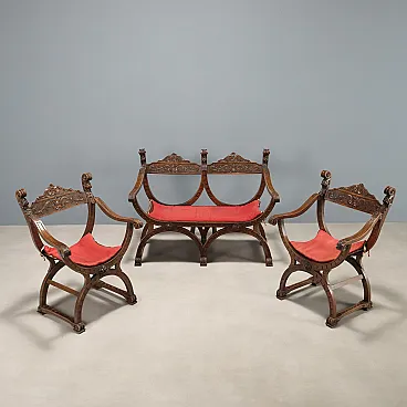 Divano con due poltrone in legno di faggio tinto noce, fine '800
