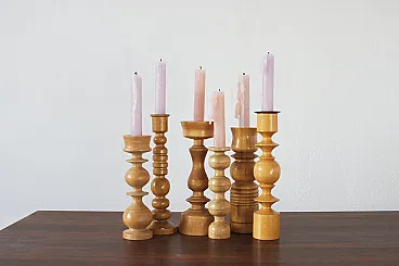 Questo set di portacandele scandinavi in legno è un perfetto esempio della semplicità e della bellezza naturale che caratterizzano il design scandinavo. Realizzati in legno, spesso di specie leggere come la quercia, il faggio o il pino, questi candelieri emanano calore e intimità, adattandosi perfettamente all'estetica minimalista del Nord. La loro forma è solitamente semplice e geometrica, il che li rende adatti a molti interni, sia moderni che tradizionali. Spesso sono progettati per esporre la struttura naturale del legno: le venature e la consistenza visibili conferiscono loro un carattere unico. Una caratteristica distintiva di questi portacandele è la loro capacità di creare un'atmosfera accogliente, soprattutto se abbinati alla calda luce delle candele. Il materiale ligneo si sposa perfettamente con il resto dell'arredamento scandinavo, che privilegia la semplicità, la funzionalità e la vicinanza alla natura. Questo set può essere un perfetto accento su un tavolo, una cassettiera o una mensola, portando un'atmosfera di pace e armonia all'interno. I candelieri scandinavi in legno, grazie alla loro forma universale, possono essere una decorazione discreta, che allo stesso tempo ha una funzione pratica. Conservati in condizioni originali. L'altezza dei candelieri varia da 24 a 18 cm - il diametro della base da 4 a 7,5 cm.