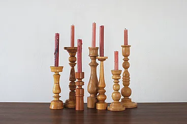 Questo set di portacandele scandinavi in legno è un perfetto esempio della semplicità e della bellezza naturale che caratterizzano il design scandinavo. Realizzati in legno, spesso di specie leggere come la quercia, il faggio o il pino, questi candelieri emanano calore e intimità, adattandosi perfettamente all'estetica minimalista del Nord. La loro forma è solitamente semplice e geometrica, il che li rende adatti a molti interni, sia moderni che tradizionali. Spesso sono progettati per esporre la struttura naturale del legno: le venature e la consistenza visibili conferiscono loro un carattere unico. Una caratteristica distintiva di questi portacandele è la loro capacità di creare un'atmosfera accogliente, soprattutto se abbinati alla calda luce delle candele. Il materiale ligneo si sposa perfettamente con il resto dell'arredamento scandinavo, che privilegia la semplicità, la funzionalità e la vicinanza alla natura. Questo set può essere un perfetto accento su un tavolo, una cassettiera o una mensola, portando un'atmosfera di pace e armonia all'interno. I candelieri scandinavi in legno, grazie alla loro forma universale, possono essere una decorazione discreta, che allo stesso tempo ha una funzione pratica. Conservati in condizioni originali. L'altezza dei candelieri varia da 34 cm a 20 cm - il diametro della base da 4,3 cm a 12 cm.