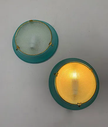 Lampada da soffitto o parete, caratterizzato da un design sobrio e funzionale tipico dello stile di F.Arte. È composta da una base circolare in metallo con finitura blu mare lucido, leggermente bombata verso l’esterno.
