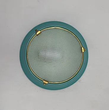 Al centro si trova un diffusore circolare in vetro lavorato a mano su stampo con una texture a rete incrociata, che serve a diffondere la luce in modo omogeneo riducendo l’abbagliamento. Il vetro è racchiuso da un sottile anello di ottone, fissato alla base tramite 3 piccole staffe dello stesso materiale, disposti in modo equidistante lungo il perimetro. L’insieme crea un effetto elegante e discreto, adatto a illuminare ambienti come corridoi, ingressi o camere da letto con un tocco di gusto vintage.