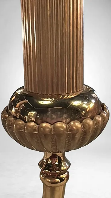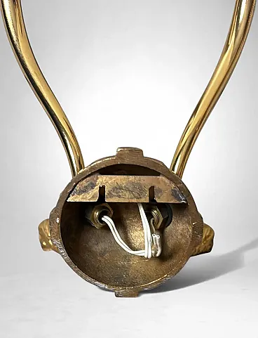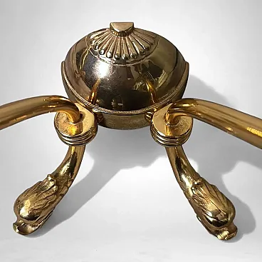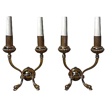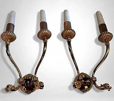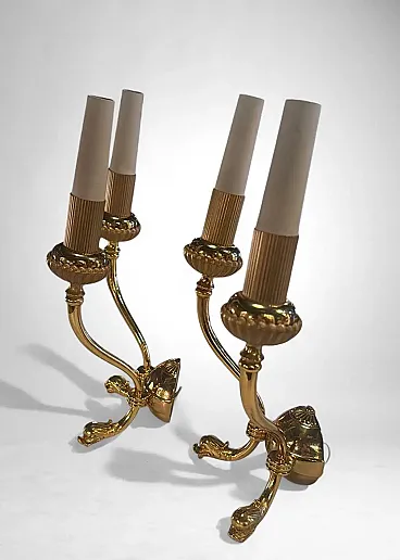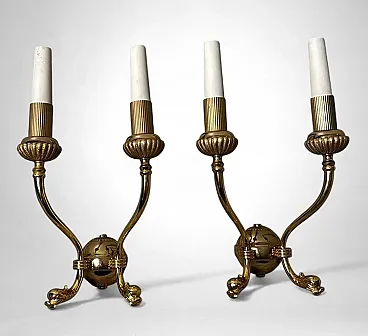 Elegante coppia di appliques italiane a due luci in ottone dorato lucido, ispirate al gusto Impero e Neoclassico molto apprezzato in Italia e Francia tra la fine del XIX e l'inizio del XX secolo. Eseguita tra il 1950 e il 1955 in un raffinato laboratorio in provincia di Milano, specializzato nella produzione di arredi e luci neoclassiche rivisitate per interni di pregio. Sebbene non siano attribuibili con certezza a un designer specifico, queste appliques riflettono un artigianato italiano di alta qualità. I bracci sinuosi e riccamente cesellati si estendono da una sfera centrale decorata e terminano in raffinati terminali a testa di delfino, un motivo decorativo legato a Venere, caro all'arte classica e ripreso durante il periodo dell'Impero come simbolo di prosperità ed eleganza marittima. I portacandele sono ornati da bobeches scanalate in stile neoclassico, che conferiscono equilibrio e proporzione alla struttura. La fusione, la cesellatura e la successiva lucidatura a mano evidenziano la brillantezza dell'ottone dorato, esaltandone i riflessi caldi e sofisticati. La solida semisfera inferiore, vuota all'interno, nasconde il cablaggio che collega le luci alle estremità dei bracci; contiene anche una piccola piastra metallica che consente di montare le applique a parete. Queste applique di produzione italiana sono ideali per dare un tocco di raffinato lusso classico a un ingresso, un soggiorno o una sala da pranzo. Possono essere esposti in modo armonioso in interni arredati in stile classico o impero, oppure come raffinato contrasto decorativo in ambienti contemporanei. Un abbinamento perfetto è quello con specchi dorati, consolle intagliate o boiserie leggere, dove la luminosità del metallo esalta il senso di spazio e raffinatezza. Le applique sono in buone condizioni. L'impianto elettrico è funzionante, ma il cablaggio è europeo; ti consigliamo di verificare la compatibilità di tensione con un elettricista prima di utilizzarlo. Possono essere utilizzati con lampadine della forma che preferisci. Dimensioni: larghezza 20 cm, profondità 13 cm, altezza 36 cm.
