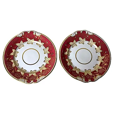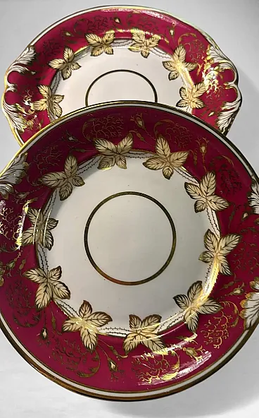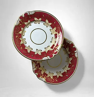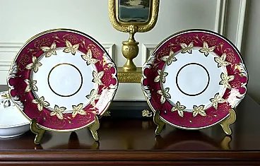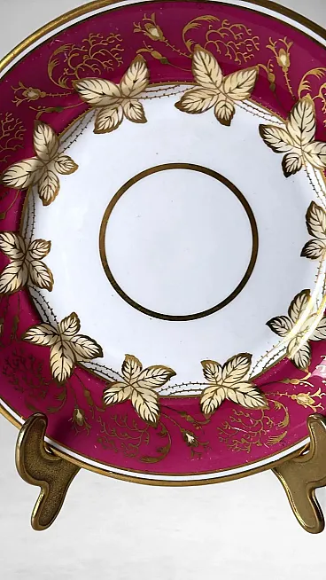 Elegante coppia di vassoi da dessert francesi "Porcelaine de Paris", finemente decorati con delicati motivi floreali eseguiti con notevole maestria. La combinazione di colori - bordeaux, bianco e oro - è raffinata e armoniosa, mentre i dettagli dorati a 24 carati dipinti a mano evidenziano l'eccezionale maestria artigianale. I vassoi sono stati realizzati in stile Napoleone III tra il 1880 e il 1885 da abili artigiani, seguendo metodi tradizionali e utilizzando caolino di alta qualità come materiale primario. I pezzi "Porcelaine de Paris" di solito non portano firme identificative, anche se a volte presentano marchi impressi sul lato inferiore o numeri dipinti a mano. In questo caso, è visibile il numero 2518 scritto a mano, che può riferirsi al modello decorativo o al codice dell'artigiano, a seconda del laboratorio di origine. Il termine "Porcelaine de Paris" non designa un singolo produttore, ma piuttosto si riferisce collettivamente ai vari laboratori e studi attivi a Parigi e dintorni, celebri per la loro maestria e raffinatezza. Molti di questi produttori sono rimasti anonimi o hanno lasciato solo pochi e rari esempi. La "Porcelaine de Paris" del XIX secolo è molto ricercata dai collezionisti ed è presente nelle principali collezioni museali di tutto il mondo. Grazie alla loro eleganza, questi due vassoi possono essere esposti con orgoglio su una credenza o all'interno di un mobile, aggiungendo un tocco di raffinatezza e prestigio a qualsiasi ambiente. Condizioni: Buono. Dimensioni: Diametro 24 cm (9,4"), altezza 3 cm (1,2").