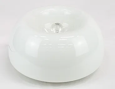 La lampada è in ottime condizioni e mantiene la sua funzionalità originale. Il vetro opalino non presenta sbeccature o segni di usura, conservando la sua trasparenza lattea. La superficie è perfettamente liscia e uniforme, senza graffi o opacizzazioni, se non qualche lieve segno in prossimità del portalampada