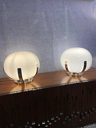 Coppia di lampade metallo cromato e opalino di Murano, anni '70