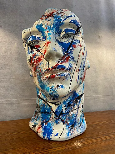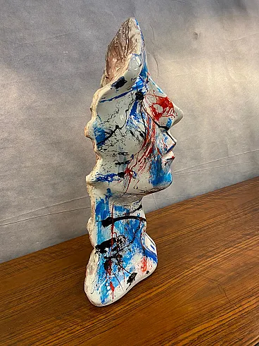 Scultura in resina realizzata da Silvio Formichetti, caratterizzata dal tipico linguaggio gestuale e materico dell'artista. L'opera rappresenta un volto umano stilizzato, trasformato in una superficie dinamica grazie a energiche colature e schizzi di colore. Toni di blu, rosso e nero si intrecciano con forza sulla base bianca, creando un effetto visivo di grande impatto.