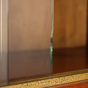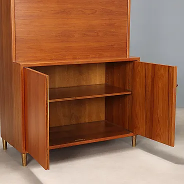 Mobile contenitore con impiallacciatura in larice e particolari in ottone, con vetrina, anta a ribalta e ante a battente. In buone condizioni generali, presenta qualche sbeccatura sui vetri come visibile in foto.