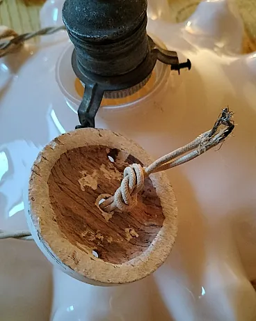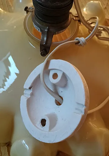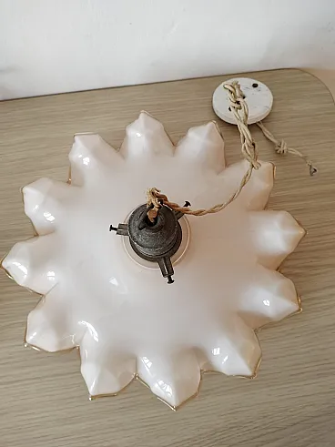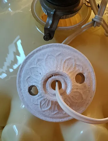 Coppia di lampadari in vetro opalino, uno giallo e uno rosa, anni '40