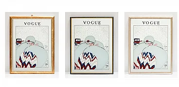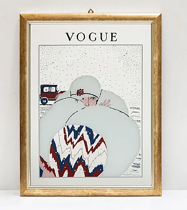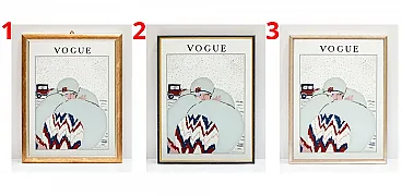 Specchio decorativo con illustrazione in stile Art Déco tratta dalla copertina della rivista Vogue, febbraio 1919 - ed. Condé Nast L'opera originale è di Georges Lepape e mostra una dama elegante in un paesaggio invernale Lo specchio è in ottime condizioni ed è proposto con tre diverse cornici in legno Ayous.