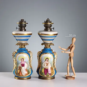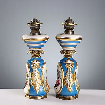 Coppia di lampade in ceramica dipinta in policromia, '800