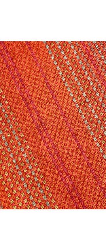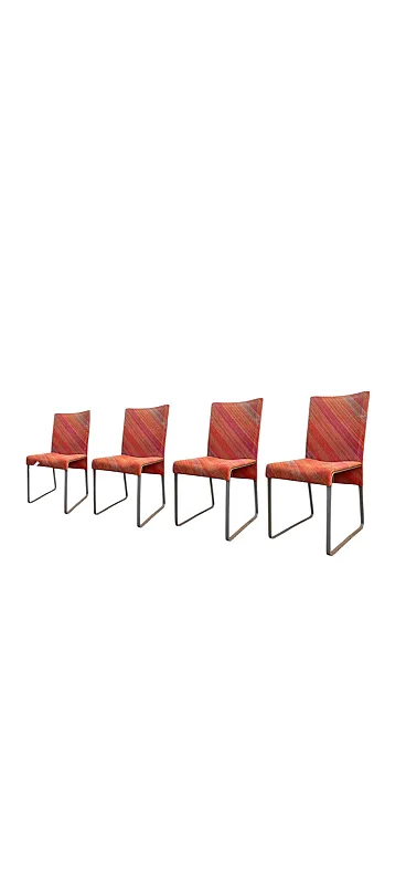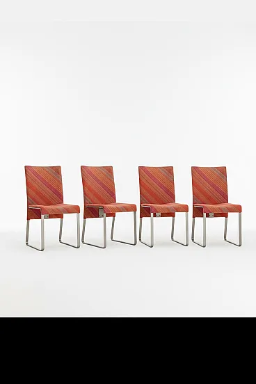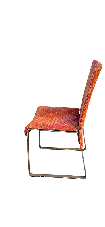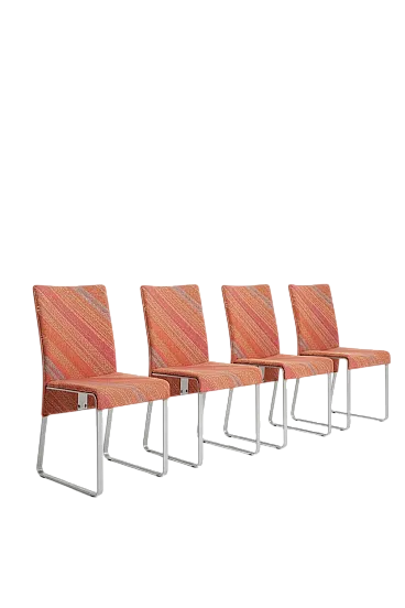 Le sedute sono rivestite in tessuto Missoni originale, con iconica trama diagonale multicolore nei toni caldi dell’arancio, rosso e rosa. Un tessuto di grande personalità, simbolo del dialogo tra design e moda che ha reso celebre il Made in Italy di quegli anni.