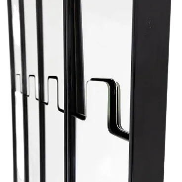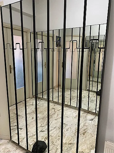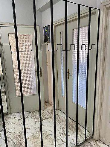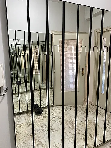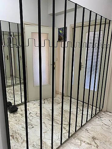 Specchio da parete modello Gronda con funzione di appendiabiti composto da moduli singoli rettangolari con vetro a specchio e struttura in plastica nera. La particolarità di questo elemento è che l’appendiabiti è a scomparsa attivabile a pressione. I singoli moduli possono essere utilizzati uno accanto all'altro o separatamente. Prodotto da Elco nel 1970 circa e disegnato da Luciano Bertoncini per Elco. Oggetti usati in buone condizioni. Misure in cm 20x6x200h - Disponibili 19 pezzi