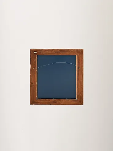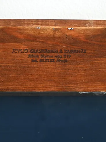 Elegante specchio svedese anni ’40/’50 con cornice in legno fasciata da una raffinata decorazione in vetro piombato: una sequenza di ovali azzurro carta da zucchero corre lungo il perimetro, creando un ritmo luminoso e grafico. Realizzato da Älvsjö Glasmästeri & Ramaffär; timbro originale presente sul retro.
