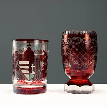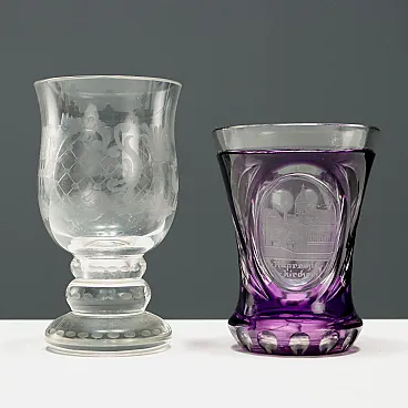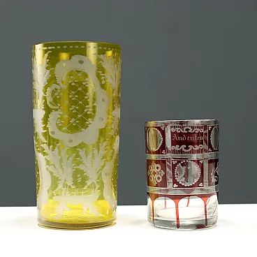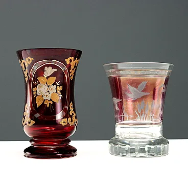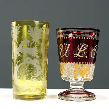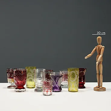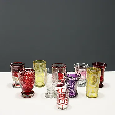 10 Bicchieri in vetro molato, inciso e dipinto, '900