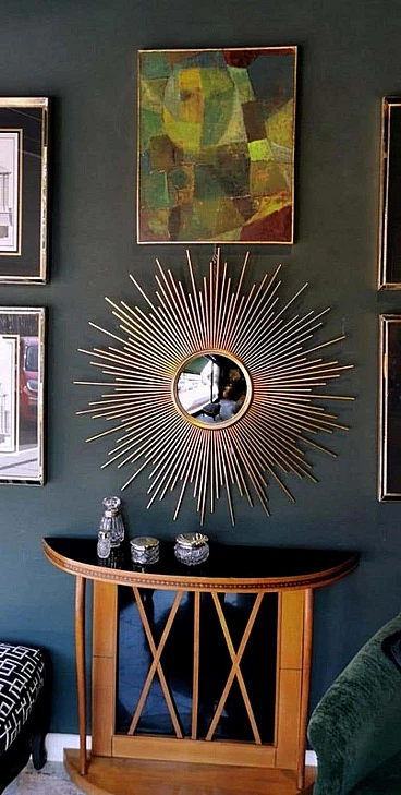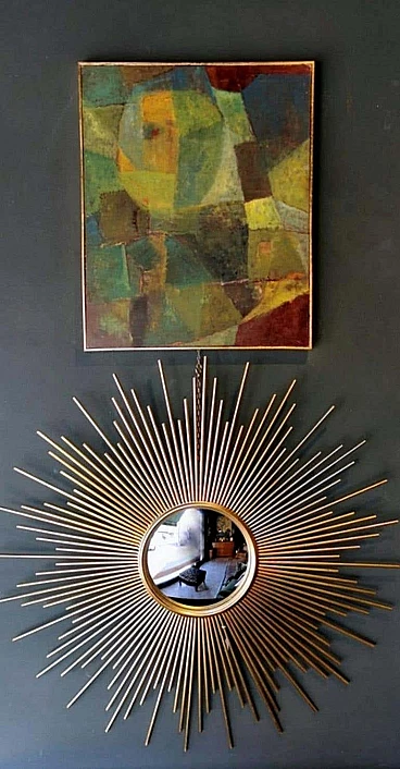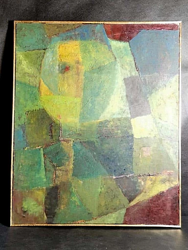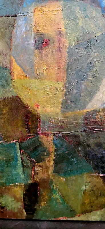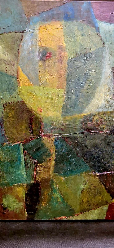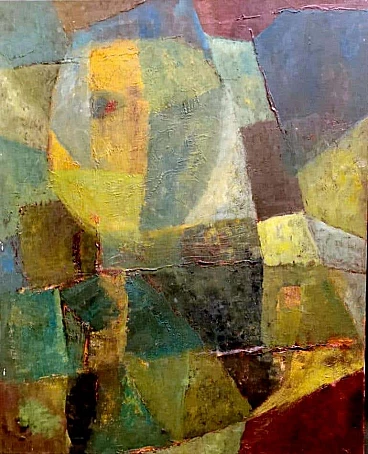 Dipinto ad olio su tela. L'autore ha utilizzato pennelli tradizionali distribuendo i colori in modo uniforme e piacevole, lo stile pittorico dell'artista si ispira all'astrattismo. L'arte astratta è quella che non rappresenta la realtà, ma crea immagini che esprimono concetti attraverso la combinazione di forme, colori e linee, l'astrattismo semplifica sempre più l'immagine, al punto da renderla irriconoscibile, affidando ai singoli colori significati che non possono più essere letti senza spiegazione, affermando chiaramente che l'arte non deve imitare la realtà. L'opera in questione si ispira all'astrattismo geometrico, dove prevale l'aspetto geometrico delle forme, anche se appena accennato e non ben definito, ma con l'uso dei colori primari. Il dipinto non è firmato e non siamo in grado di dare informazioni sull'autore, ma ne confermiamo la straordinaria vivacità estetica e coinvolgente, un'opera che con la sua gioiosa freschezza e l'alto effetto decorativo si presta facilmente ad arredare qualsiasi ambiente della casa. Realizzata in Francia tra il 1960 e il 1968. A completare la tela è stata aggiunta, in tempi recenti, una piccola cornice in legno dipinto in oro, realizzata a mano.