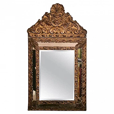 Elegante cornice d'epoca napoleonica con specchio centrale, quattro specchi ai lati e ricchi ornamenti; è stata realizzata con decorazioni in ottone lavorato a repoussé (goffratura = tecnica di rilevamento di bozze, figure o disegni prestabiliti sulla superficie della lamiera con martello e punzoni arrotondati sul retro). Le elaborate decorazioni sono in stile rococò francese con fiori, frutta e rocailles, le lastre sbalzate sono state lavorate a mano su un dorso di legno, gli specchi sono una parte molto importante, infatti, è stata realizzata con l'antica tecnica del mercurio, che consisteva nel posare il metallo su una serie di strati di stagno appiattiti sul vetro, il mercurio veniva poi lisciato e lucidato con una pietra speciale e tamponato, la miscela così ottenuta veniva chiamata argento vivo. Questa tecnica fu messa a punto dai maestri vetrai veneziani (Maestro Dal Gallo 1507); la Repubblica di Venezia nascose l'opera in segreto, ma col tempo si sviluppò dalla città e si diffuse nei paesi europei, prima fra tutti la Francia: la Galleria degli Specchi del Castello di Versailles è decorata con centinaia di specchi al mercurio. Le imperfezioni dei nostri specchi, le piccole macchie e la loro patina superficiale velata, ne attestano l'antichità e l'autenticità. Un'opera altamente decorativa che può essere collocata in qualsiasi ambiente della casa, infatti, lo specchio ha la capacità di trasformare una stanza, dando carattere e creando interessanti e coinvolgenti illusioni prospettiche. Realizzato artigianalmente in Francia tra il 1852 e il 1855. Specchio interno in cm: 17 x 23.