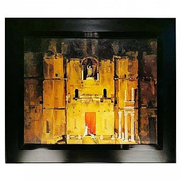 Dipinto ad olio su tela, la pittrice ha raffigurato una scenografia teatrale, ambientata in un sito archeologico romano, ha schematizzato l'intero paesaggio, ma riconosce il Tempio di Marte nel Foro di Augusto a Roma, per sottolineare e rafforzare l'intera scena ha collocato la statua di Augusto in una nicchia in alto per dominare la recitazione degli attori sulla scalinata sottostante. La caratteristica principale di quest'opera è la bella distribuzione della luce che diventa una sorta di faretto, un riflettore che mette a fuoco i dettagli e i temi desiderati dal pittore, facendoci concentrare sulla scena primaria dell'opera. I due elementi del dipinto sono la luce centrale e l'oscurità sfumata sui lati, il contrasto tra luce e buio non crea dissonanza, ma i due elementi opposti si completano a vicenda, evidenziando un fatto importante: la luce diventa protagonista del messaggio del pittore. Lo sfondo non esiste più, ci troviamo di fronte a un chiaroscuro enigmatico e inquietante che sollecita l'anima. Grazie all'uso mirato della luce, questo quadro ha il potere di ammaliare, incantare e stupire. Il dipinto è firmato Anne Ouilem, dipinto tra il 1965 e il 1970, non abbiamo molte notizie sull'autrice, sappiamo che è una grande pittrice francese che ha vissuto e lavorato a Brie (una regione a est di Parigi) negli anni '60-'70 e ha partecipato al XXXI Salon des Artistes Occitans 10.12.66 / 1.167 a Tolosa. Struttura in legno laccato nero dell'epoca. Misure tela cm: 70 x 90.