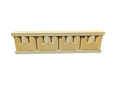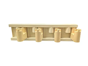 Questo raffinato appendiabiti da muro modello Minivip è un’icona del design italiano anni 70, nata dal genio degli architetti Benanti e Brunori per la celebre azienda Velca Legnano. L'oggetto si distingue per un’estetica minimalista e funzionale in plastica ABS color crema, caratterizzata da quattro ganci a scomparsa che, quando chiusi, mantengono una linea pulita e geometrica. La struttura originale riporta sul retro il marchio di produzione e la dicitura del brevetto, a testimonianza della sua autenticità e dell'eccellenza manifatturiera milanese del periodo. Rappresenta un pezzo da collezione ideale per chi desidera aggiungere un tocco di modernariato Space Age a un ingresso o a un ufficio contemporaneo.