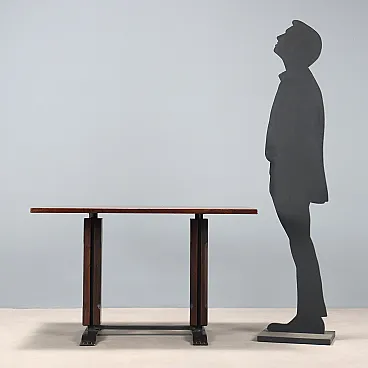 Tavolo con base in metallo e impiallacciatura in legno esotico, '900