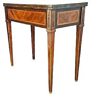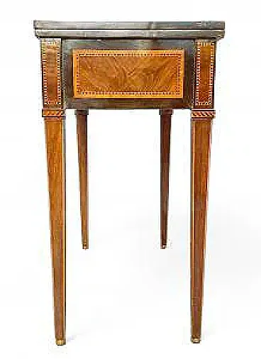 Splendido tavolo da gioco "a libro" di area ligure (Genova), databile all'ultimo quarto del Settecento. Il mobile incarna perfettamente il gusto neoclassico del periodo Luigi XVI, caratterizzato da linee sobrie, proporzioni equilibrate e una straordinaria cura nella scelta dei legni esotici.